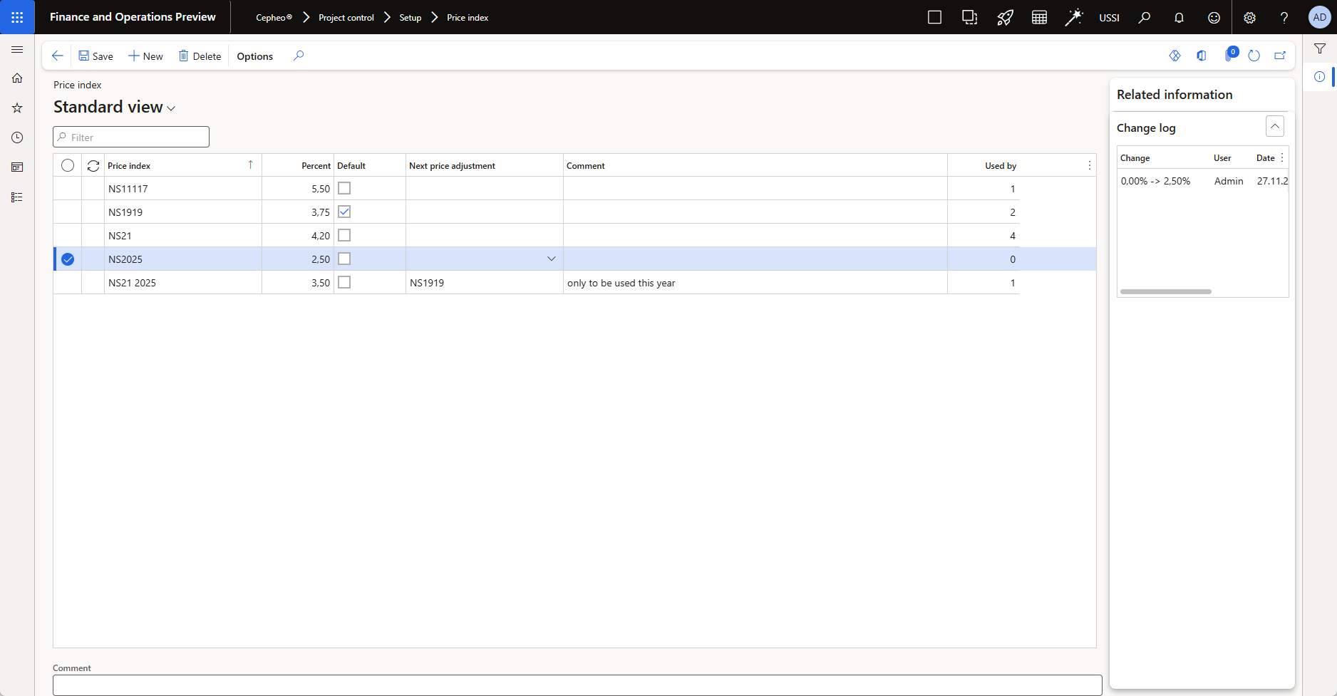 First step is to create the indexes to be used on the projects: Cepheo® > Project control > Setup > Price index