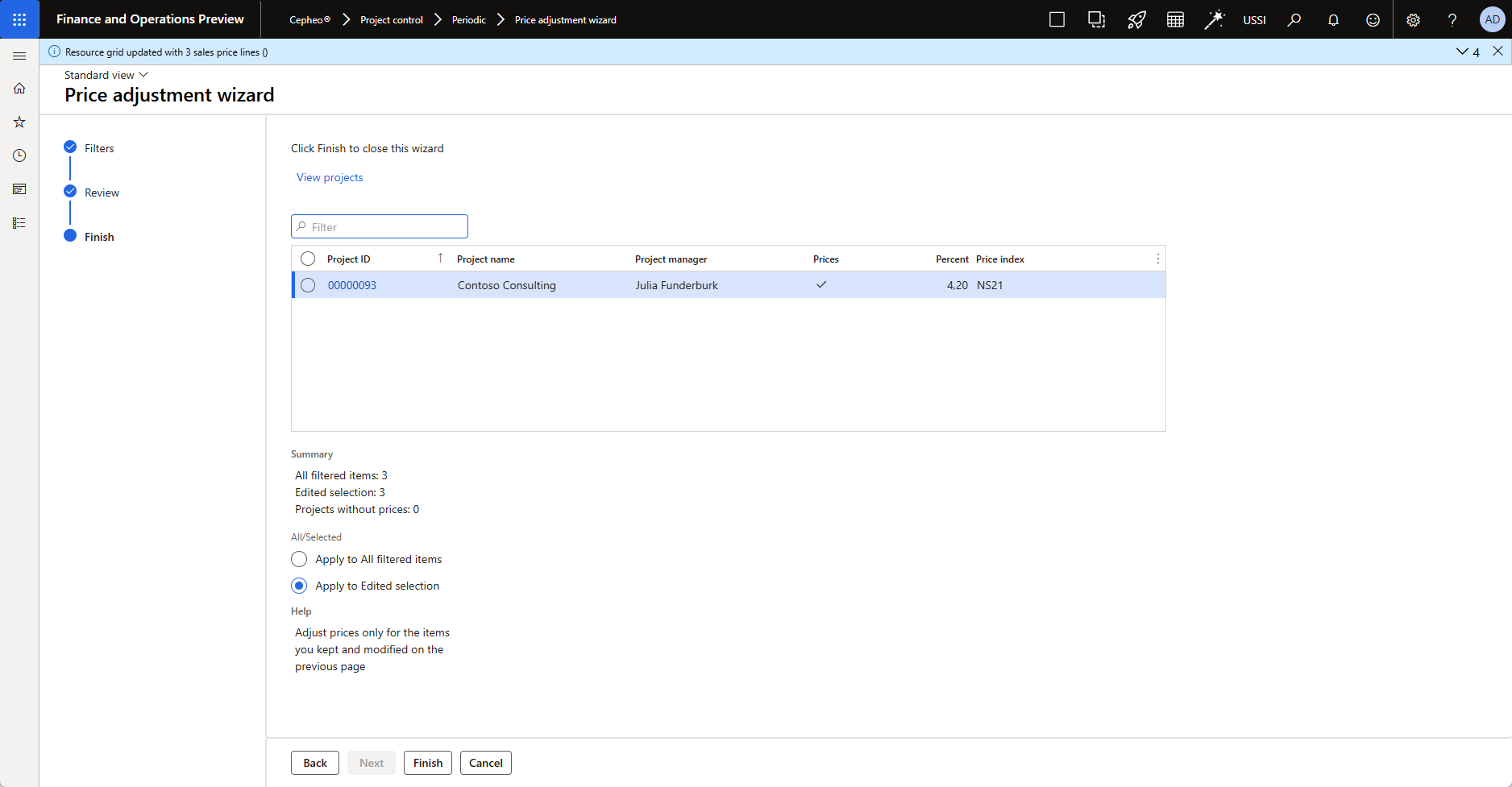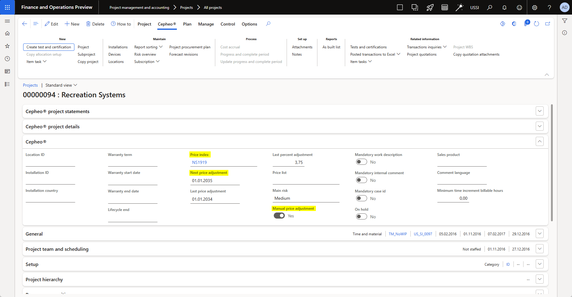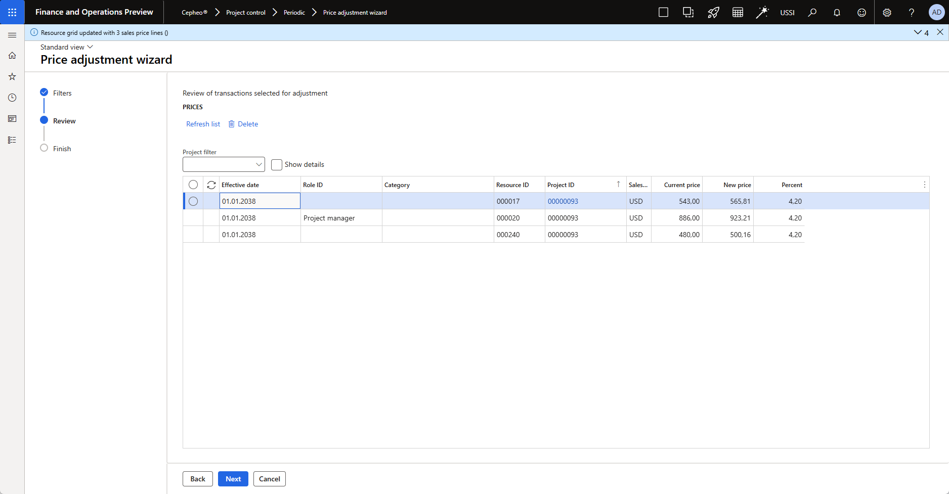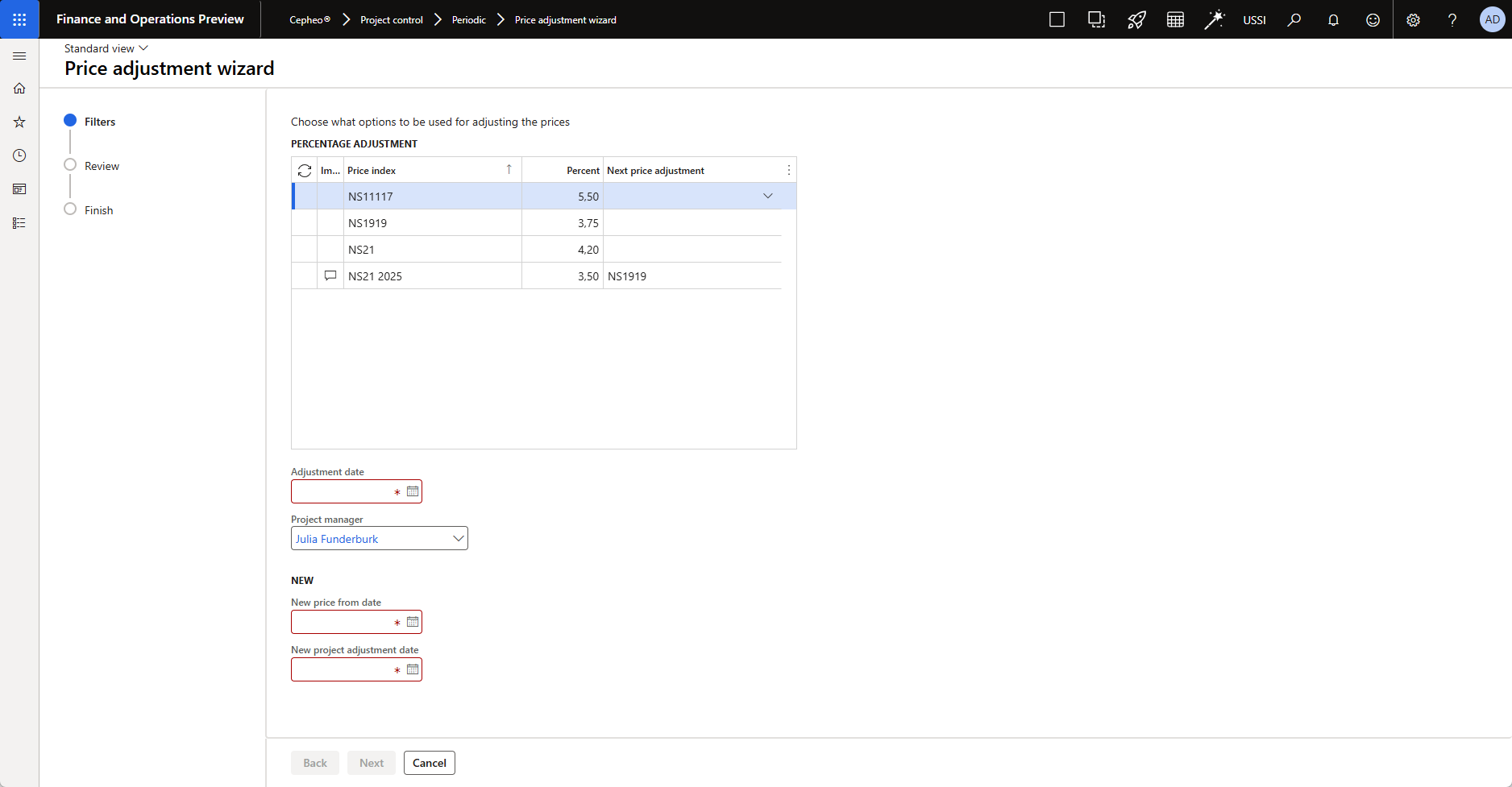 Then start the price wizard: Cepheo® > Project control > Periodic > Price adjustment wizard