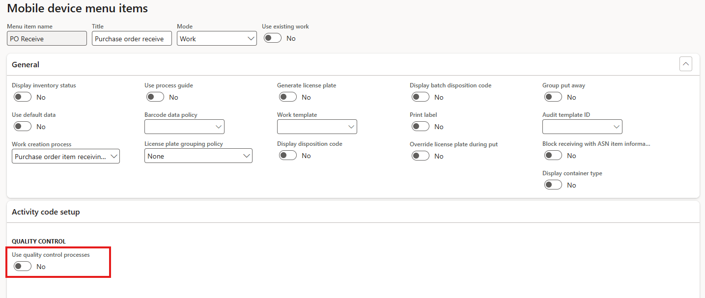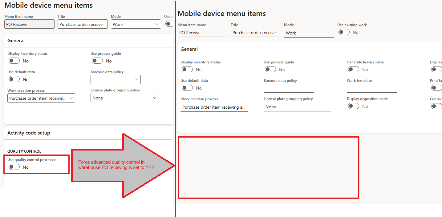 The same Mobile device menu item can be seen there for two different settings of the Force advanced quality control in warehouse PO receiving flag. On the left, when the value is set to No; on the right, after it has been switched to Yes.