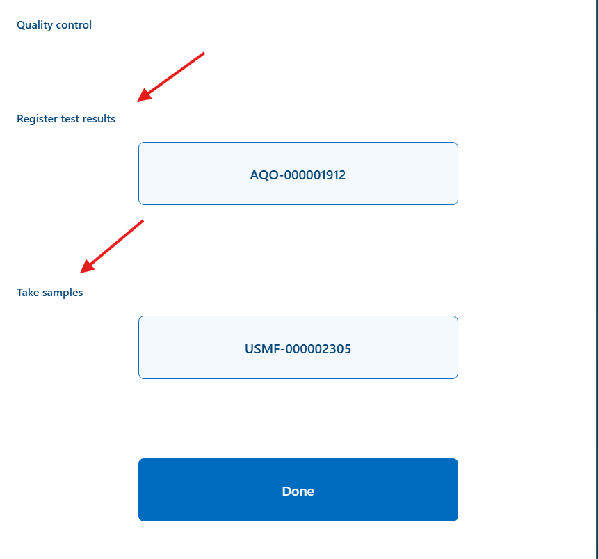 The triggering of quality control processes (take sample and register test result) may be configured for specific Mobile device menu items. For selected work creation processes, the system displays an additional option called Use quality control process.