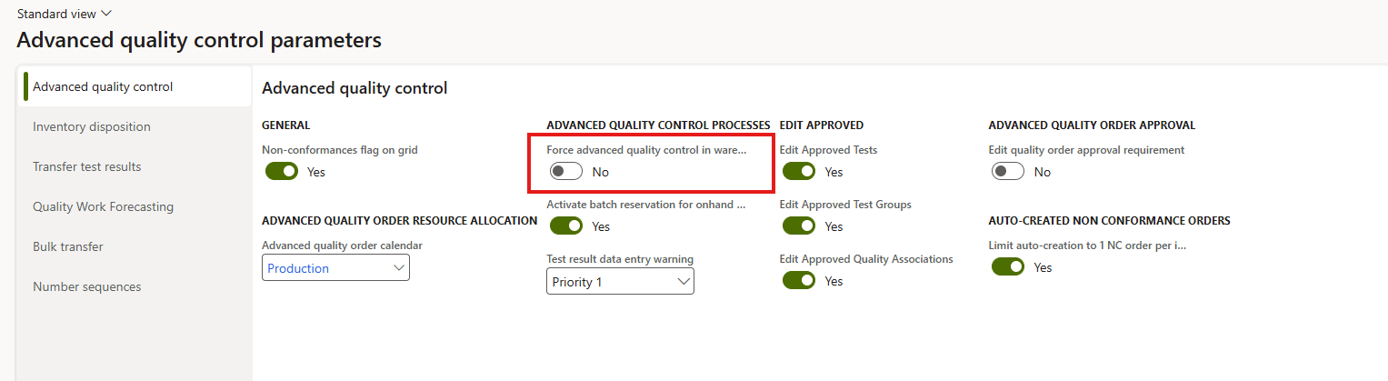 For the menu items used in these processes, it is possible to force the triggering of sample collection and/or the registration of test results by using the Force advanced quality control in warehouse PO receiving option. This option is available on the Advanced quality control tab in the Advanced quality control parameters form (Path: Quality > Setup > Advanced quality control parameters), as shown in the screenshot below: