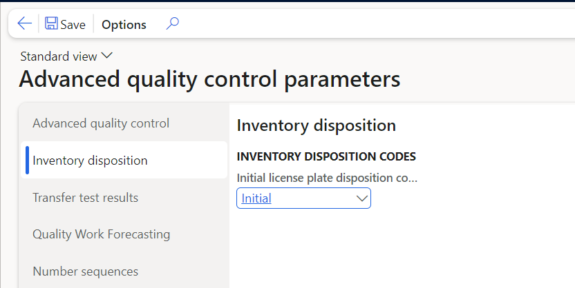 Initial license plate disposition code | Default disposition code that is allocated to a license plate when on-hand is added to it. An item specific value can be setup on Released products. We recommend that products that are subject to quality control are set up using a 'blocking' disposition code, so that is it the results of the advanced quality orders, that determine whether a license plates on hand qty is released (made available) or not. | (YES) |