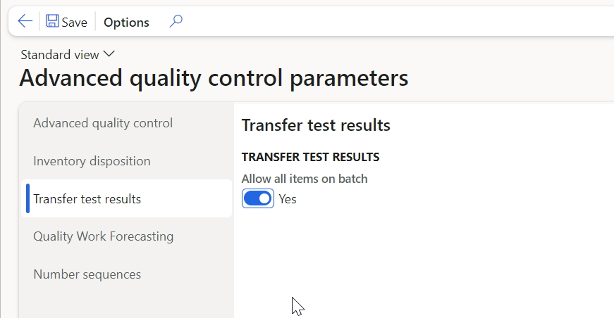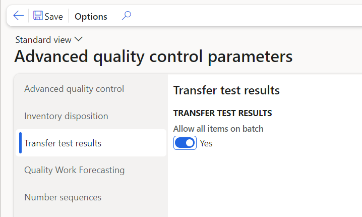 Allow all items on batch | Transfer test results from all items with the same Batch number. This is e.g., very useful if you are using the same batch number for the bulk and the Finished product and you take out sample for analysis during both and want result from both batch/products to possible to transfer to the batch. | NO |