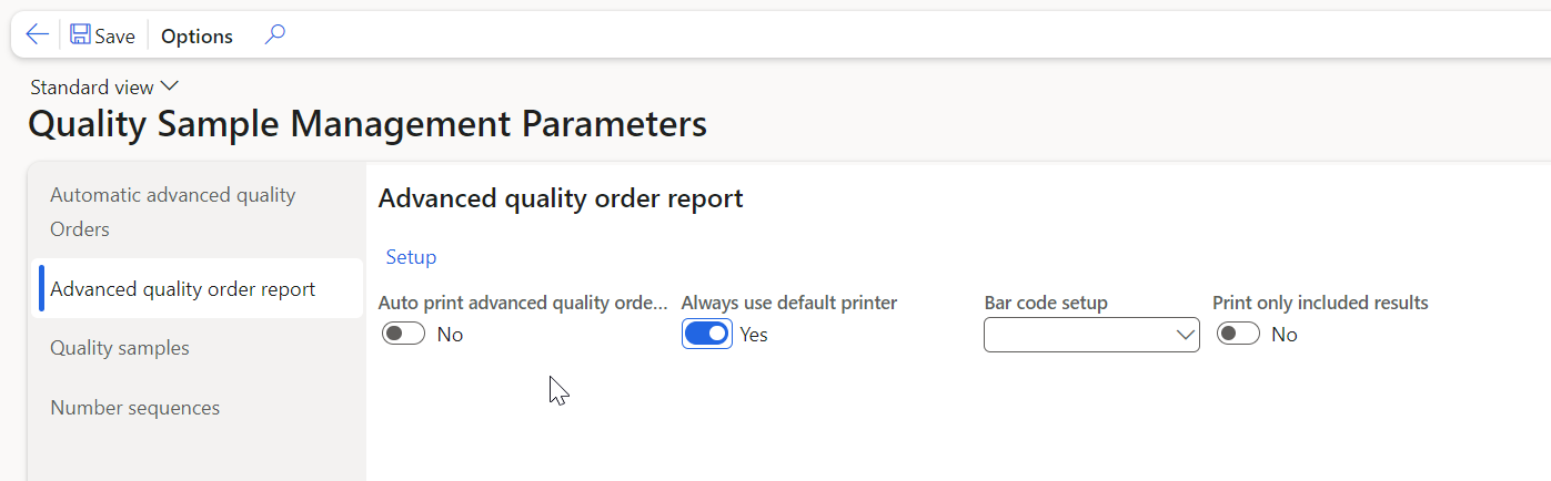 Auto print quality order | Is a quality order report going to be printed automatically when a quality order is created? The number of wanted reports is defined for each test group. NOTE : If you are using a setup in the Advanced quality associations where you during purchase receive in the warehousing app. trigger a sample that is then auto-registered in lab to create an adv. Quality order, the report should not be set up to be auto-printed. NOTE : When using the Warehouse management app to perform sample registration and thereby creating advanced quality orders to be automatically printed, the printing will not be performed. | |