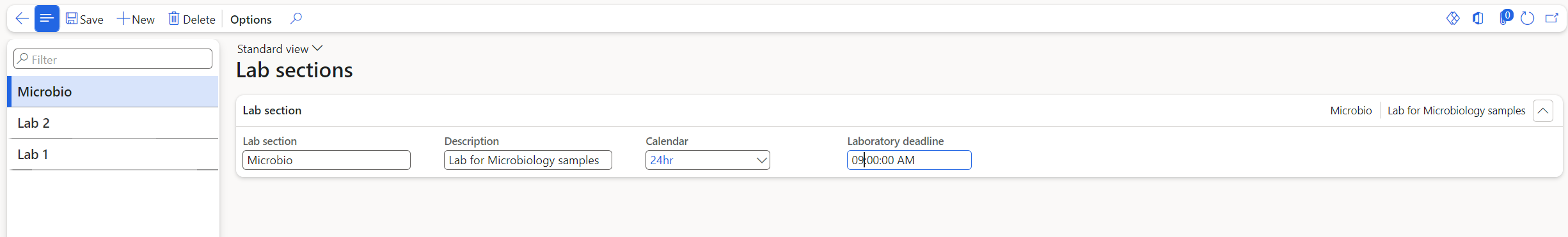 Path: (Quality\Setup\Quality control) This functionality allows for the creation of laboratory sections that can be connected to calendars. The calendar is used to decide when a quality order can be executed. The Laboratory deadline is the 'cut-off' time of the calendar days used when testing samples.