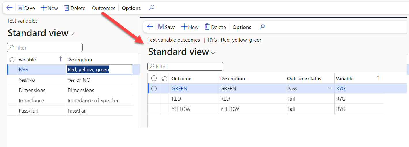Path: (Quality\Setup\Quality control) In situations, where you are performing simple qualitative testing, like a visual inspection, it is possible to create variables that can have different outcomes, which decide whether a test will pass or fail. The test variables are linked to tests (of type Option) in the various test groups. This is a supplement to actual quantitative testing, where the results of specific measurements decide whether a result is a passing or failing value for a test.