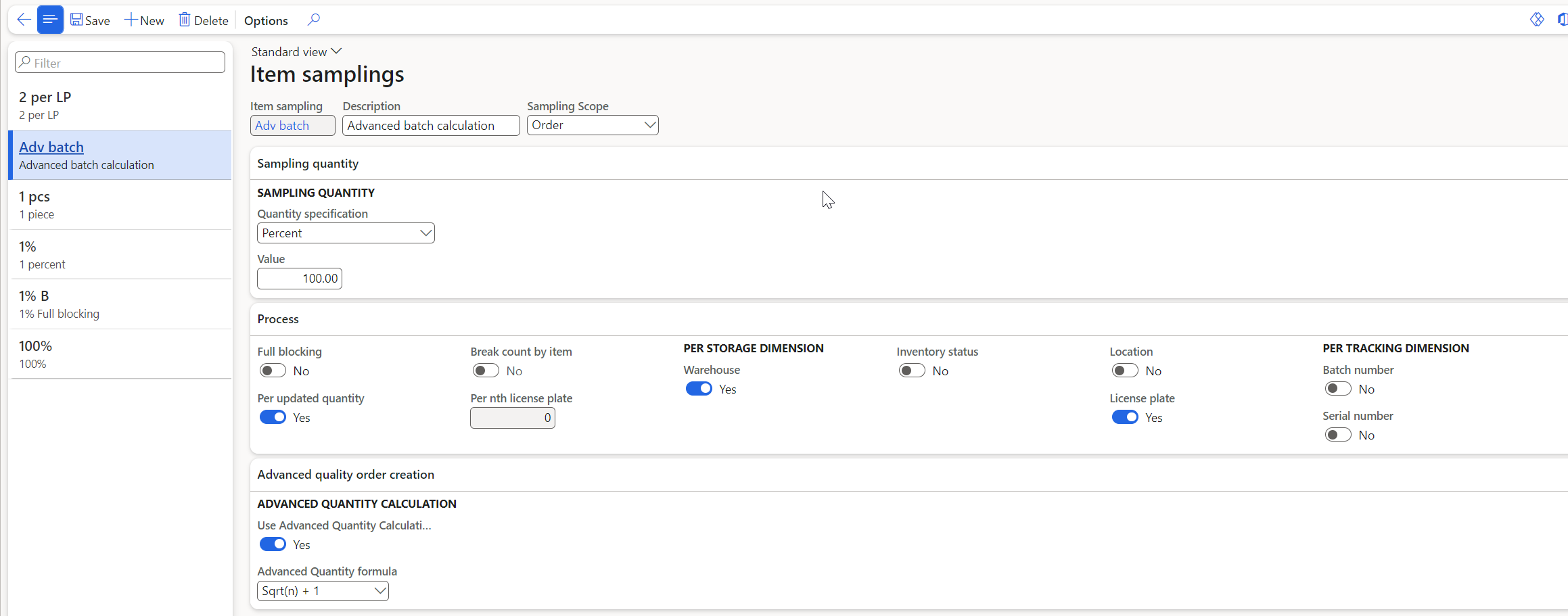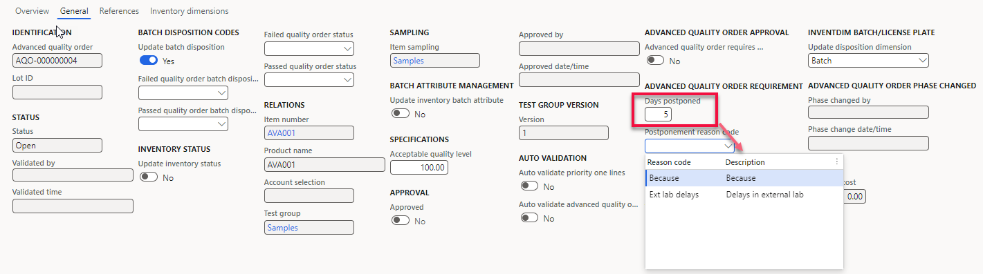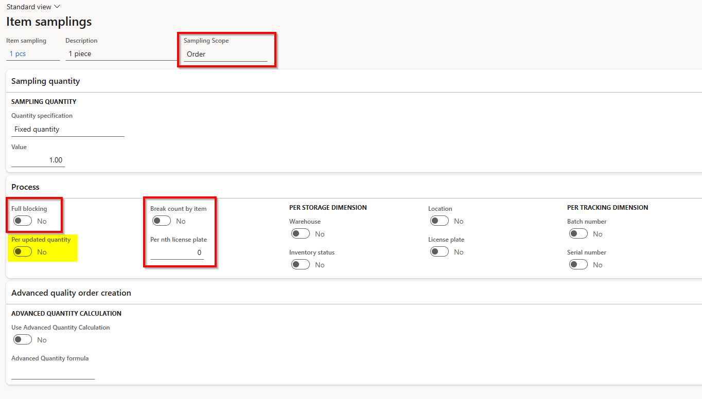 - Advanced quality orders do not create inventory transactions for the quantities calculated by item sampling. This means standard inventory dimensions, like Inventory status, are not utilized, and restrictions have been removed for creating advanced quality orders.