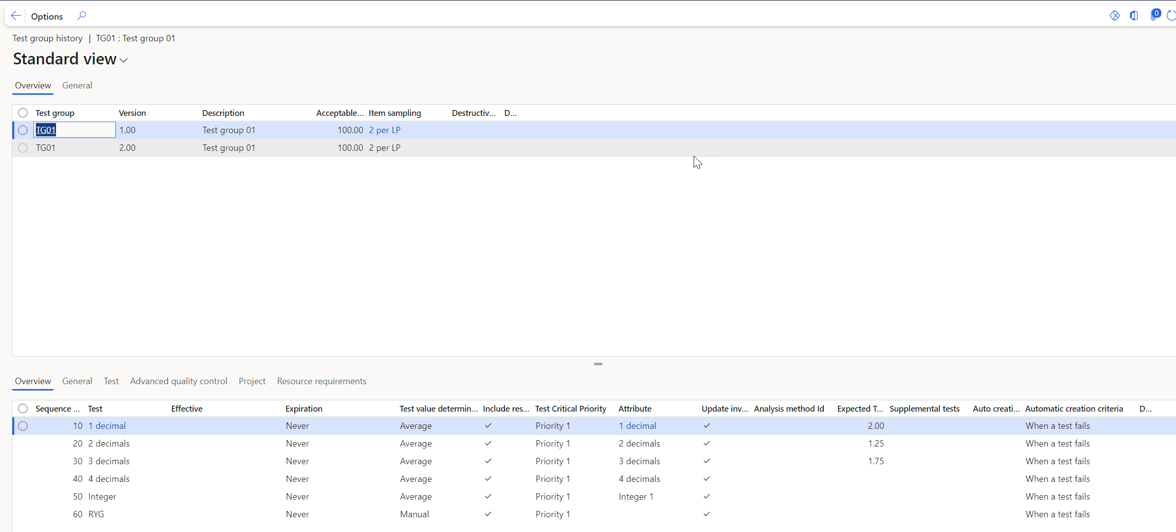 When opening the test master overview form, all test setup for the product is presented. Also test setup where the product is part of a quality group or in other ways is setup for testing, is shown.