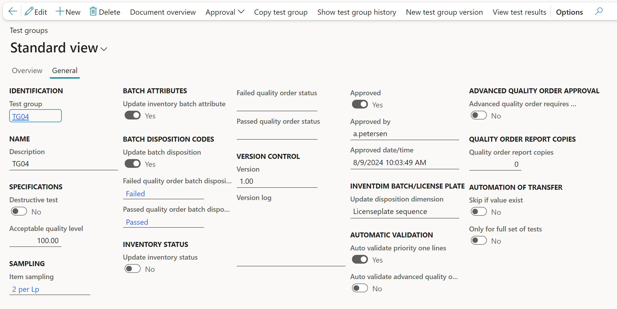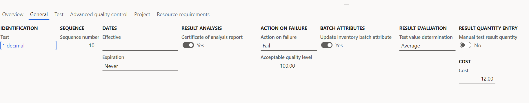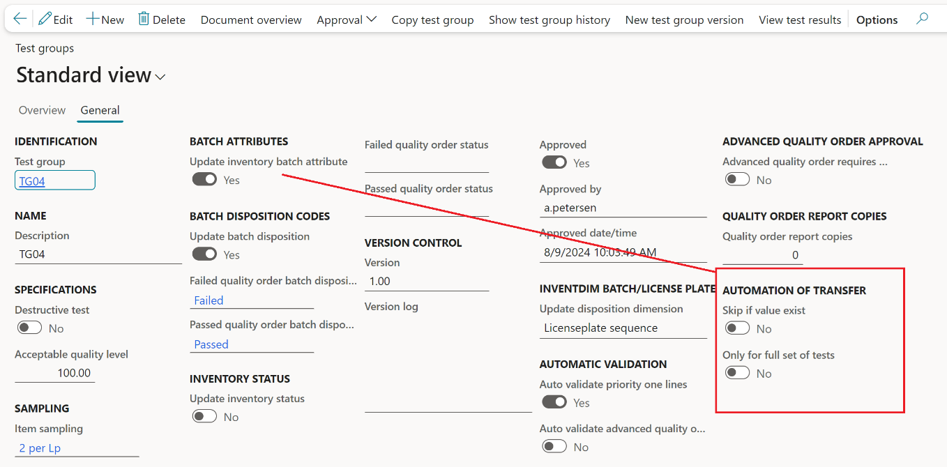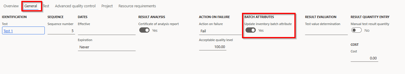 The settings on the test group lines will determine, which tests will transfer test results to batch attributes. This is done by toggling the “Update inventory batch attributes” parameter on the General tab to yes.