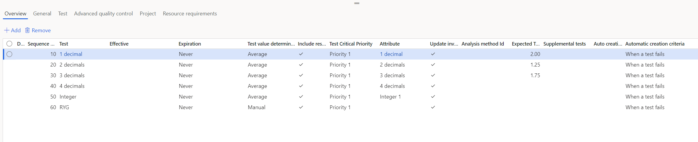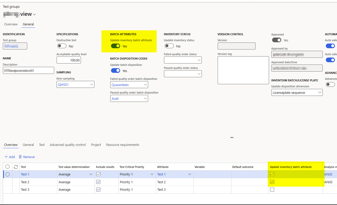 On the test group lines below there are only checkmarks in “Update inventory batch attributes” for the first two test.