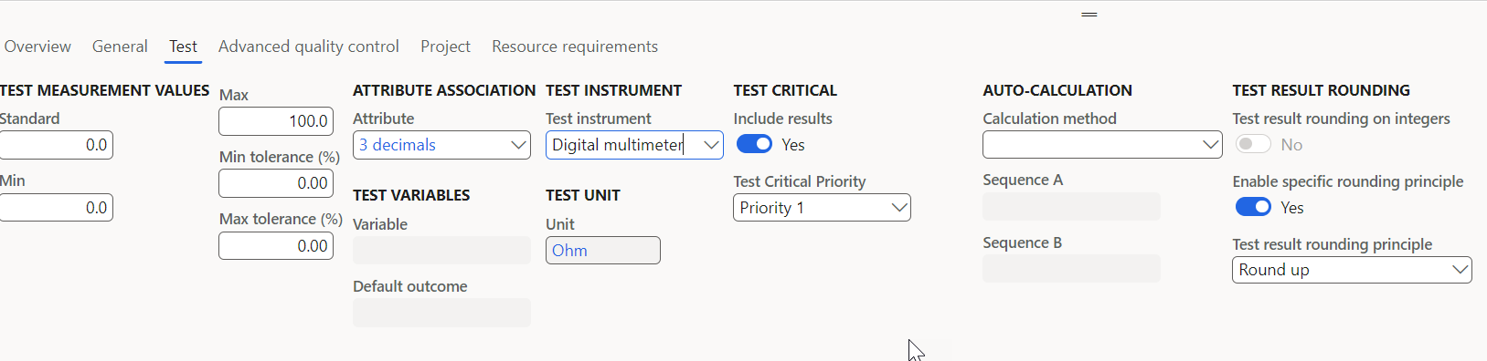 Test rounding principle | Test results and test values will be rounded off using the rounding principle specified. The following principles can be selected for all types of tests setup for all decimal precisions selected for the test unit. Round to nearest (always to nearest value) Round up (always rounded up) Round down (always rounded down) | No |