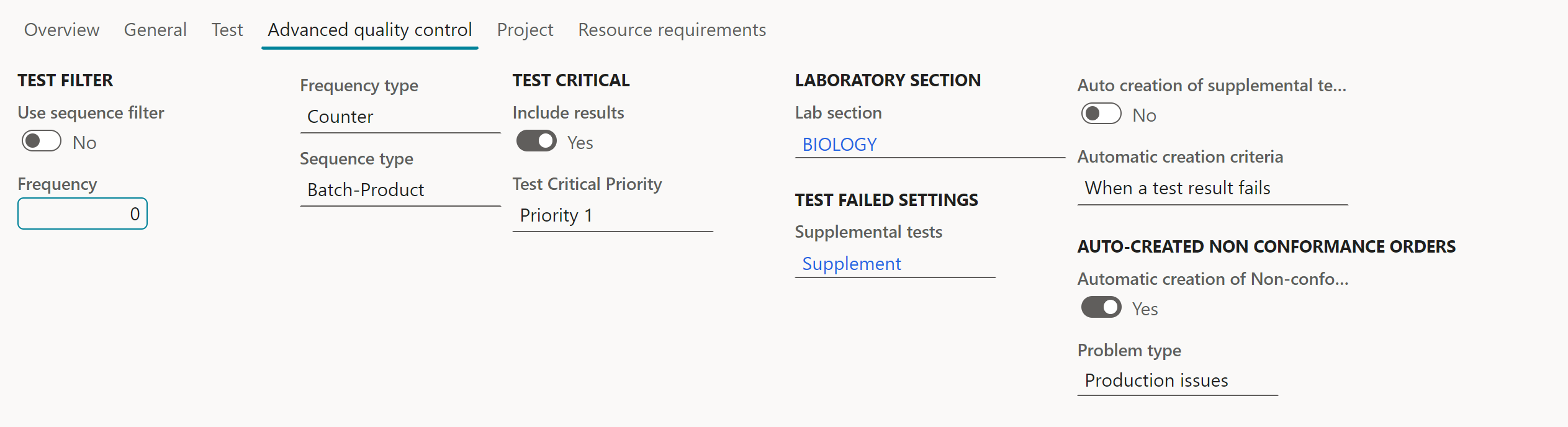 - Set the parameters on the test group lines where a failing test/test result should trigger the creation of an internal NC order, the field group ‘Auto-created Non-conformance orders’ is located in the tab page Advanced quality control- Set parameter to YES if you want a NC order to be created automatically, either when a test or a test result fails, and add a problem type linked to the new Non-conformance order type ‘Advanced quality order’ (can be changed on the NC order if needed):