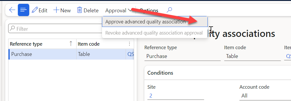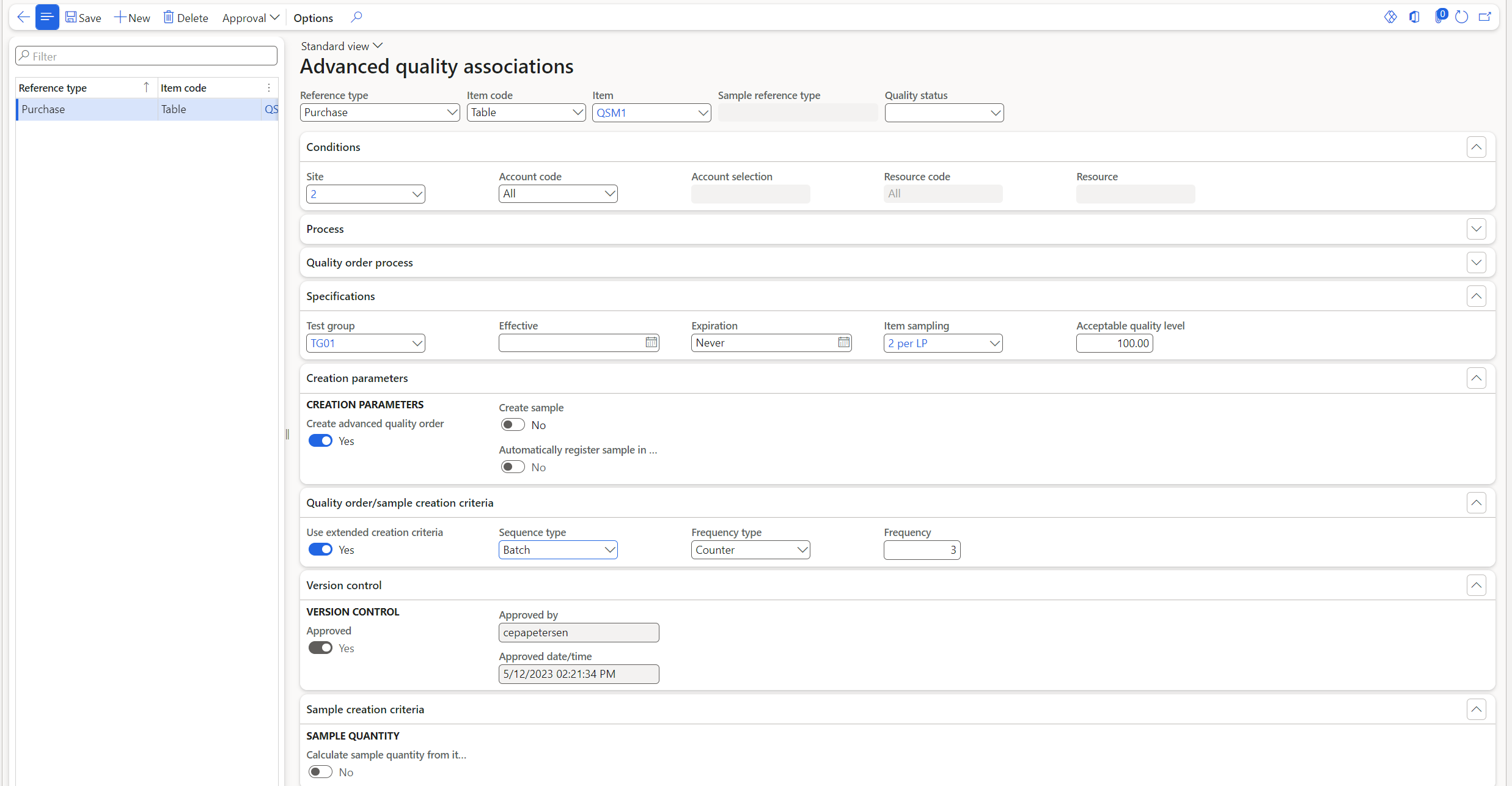 When approval has been performed, it is not possible to edit the record, unless the parameters to allow edit for approved quality associations is activated in the parameter settings.
