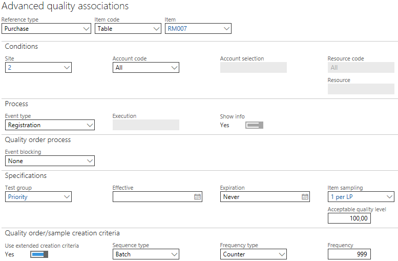 For advanced quality associations with a reference type "Quality sample," this field should not be set to "yes." Doing so can disrupt the code responsible for creating advanced quality orders, resulting in incorrect numbers of orders or frequencies.