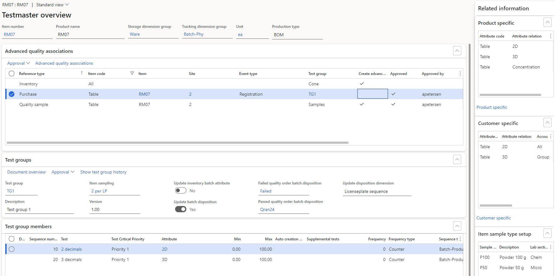 To get an overview of the total test setup for a specific item number, a test master overview form is available. The form can be found from the released product in the quality section.