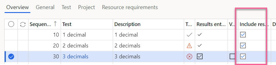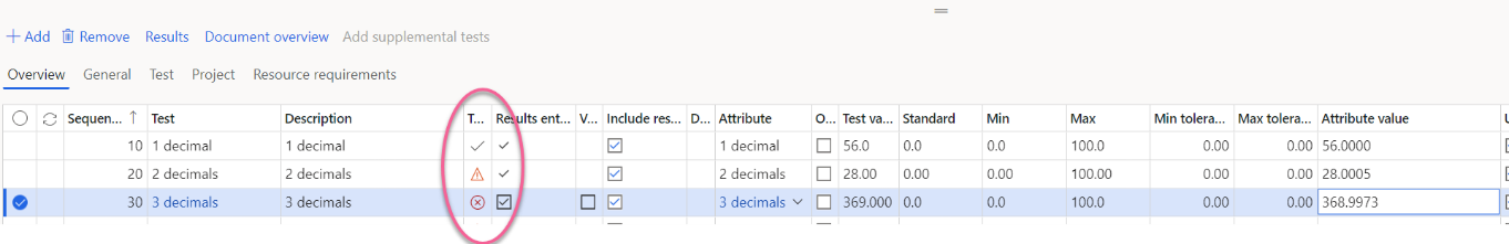 The test lines for a quality order, indicates outcome of test results. The following icons are used: