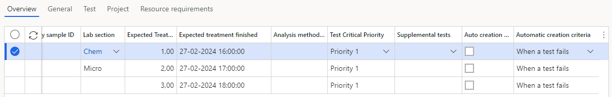 Expected treatment time | Expected duration of test in centi hours (ex 1.5 = 1 hour and 30 min), is used to calculate the Expected completion time according to a calendar setup for the chosen lab section | No |