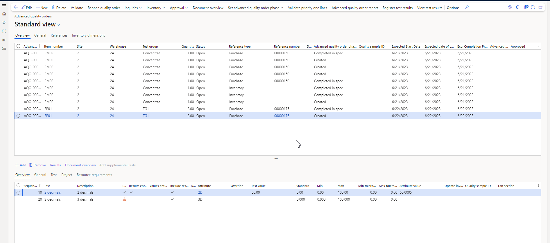 Path: (Quality\Common\Advanced quality order) A advanced quality order defines a set of one or more tests (via the test group) that must be performed for an item and a test quantity of its related order (such as a Purchase-, Sales, RMA-, Transfer- or Production order..) or a test quantity of its inventory.