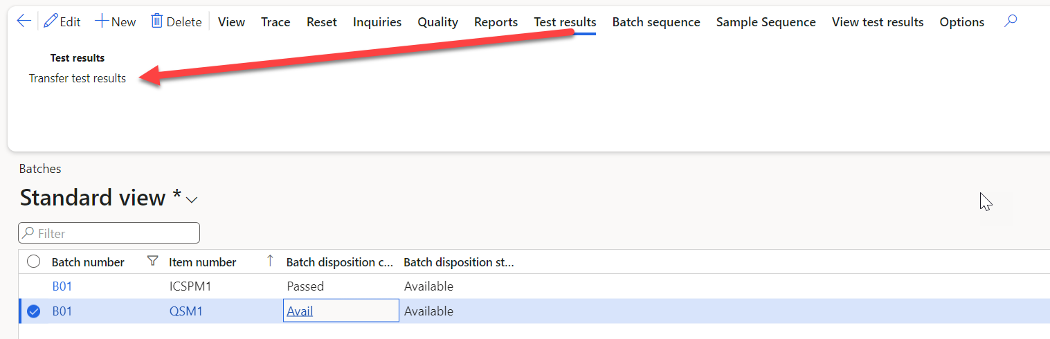 Path: (IM\Inquiries\Dimensions\Batches) In standard D365FO it is only possible to have a single open quality order relating to a batch. Therefore, it is also only possible to transfer test results from this quality order to the attributes of that batch.