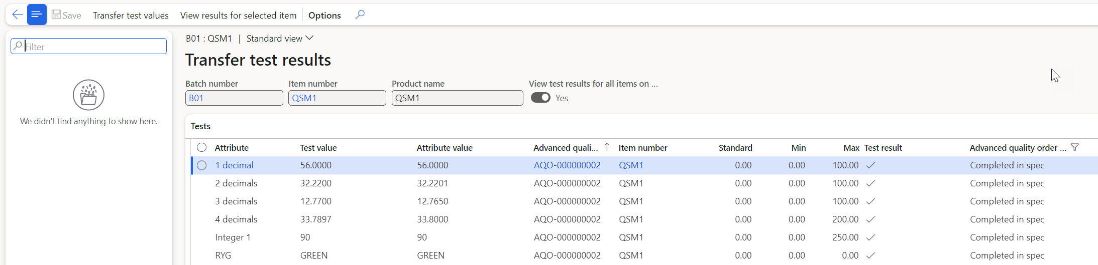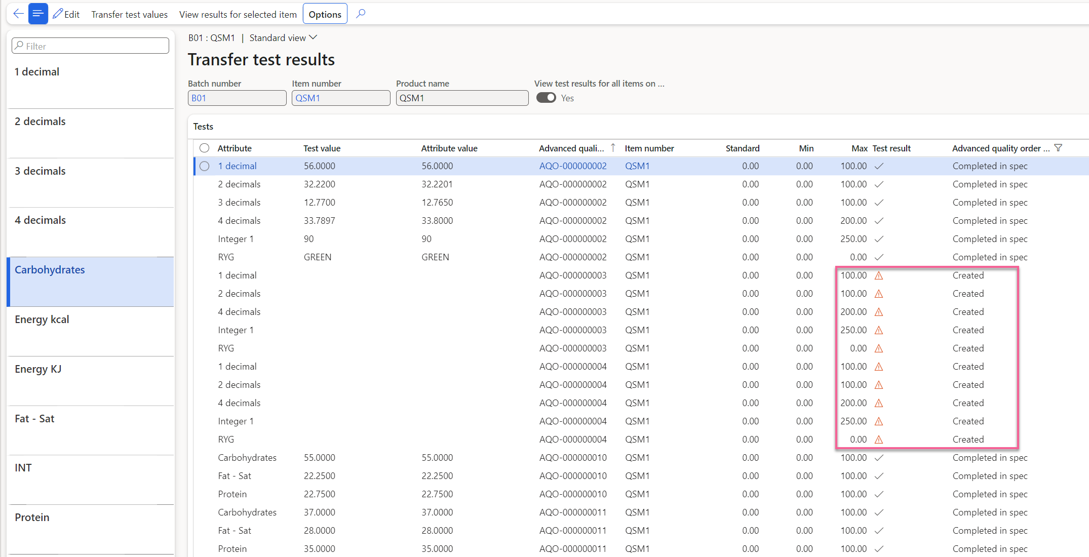 Whether you want batch attribute values to be transferred to the batch number of the adv. Quality order to be manually (e.g. if you have multiple test results per adv. quality order line and want to decide which should represent the batch attribute on the current batch) OR if you want a more automated process, it is all possible based on certain parameters.