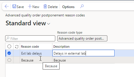 In the form ‘Advanced quality order postponement reason codes you can create and maintain reason codes used when entering several days to postpone an Adv. Quality order: