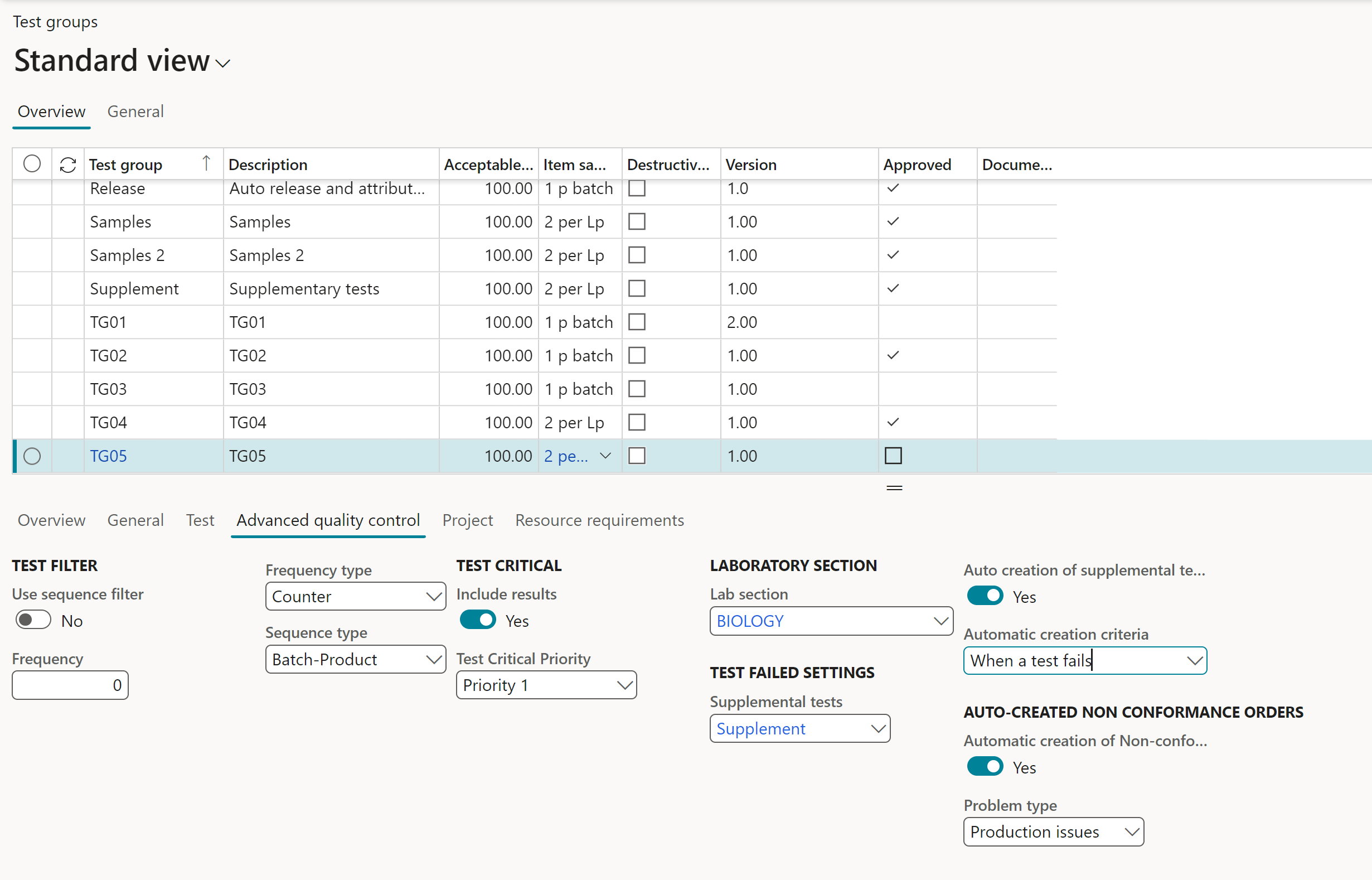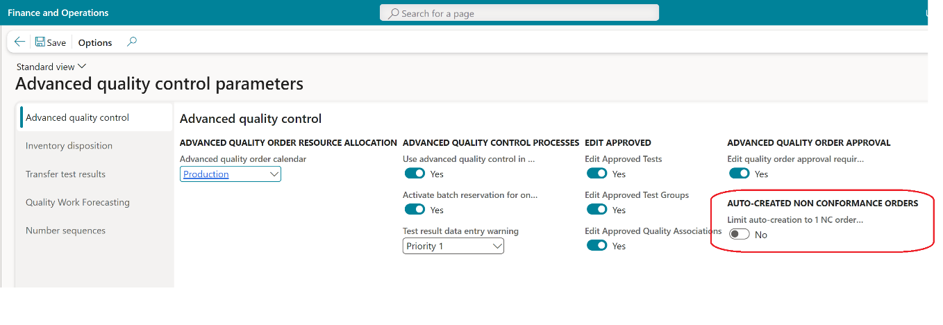 Each manufacturer is required to establish and maintain procedures to control products that don’t conform to specific requirements (21 CFR 820.90). In D365FO/SCM this can be handled via non-conformance orders. These can be created manually and are linked to standard as well as Advanced quality orders. A more automated process has been made, making it possible to auto-create NC order of type ‘Advanced quality order’ when a test/test result fails. This process is linked to the triggering of supplementary tests (see 4.3.12.5) when a test or even just a test result holds a failing value.