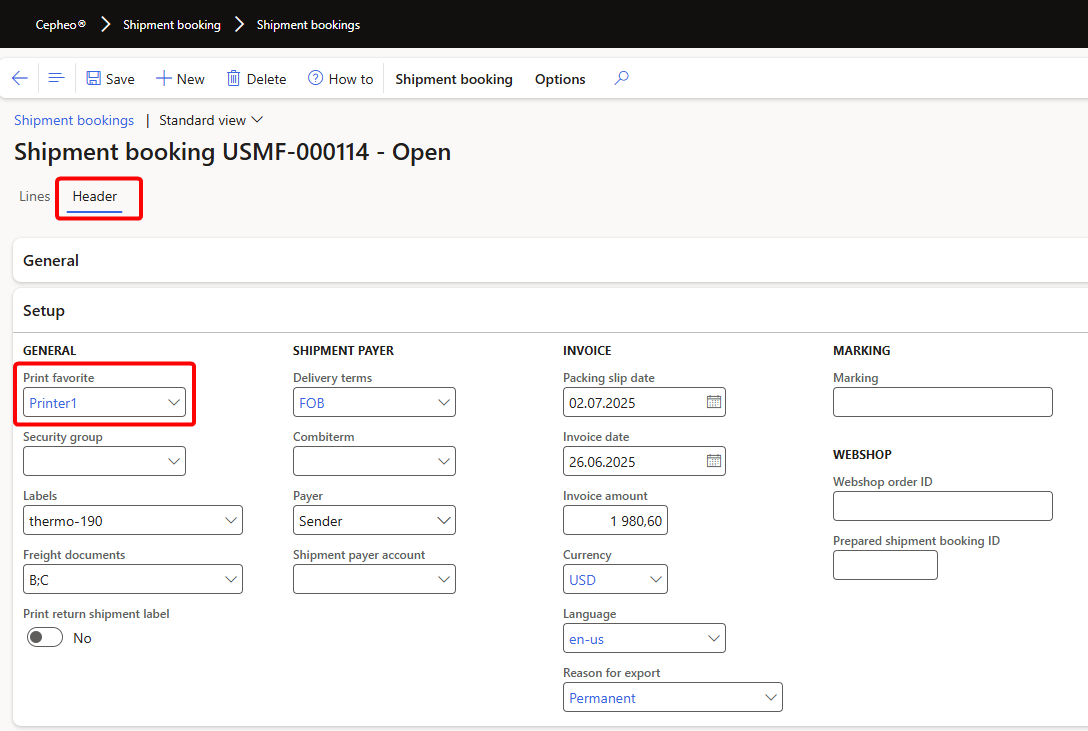 Navigate to Cepheo® > Shipment booking > Setup > Shipment print favorites