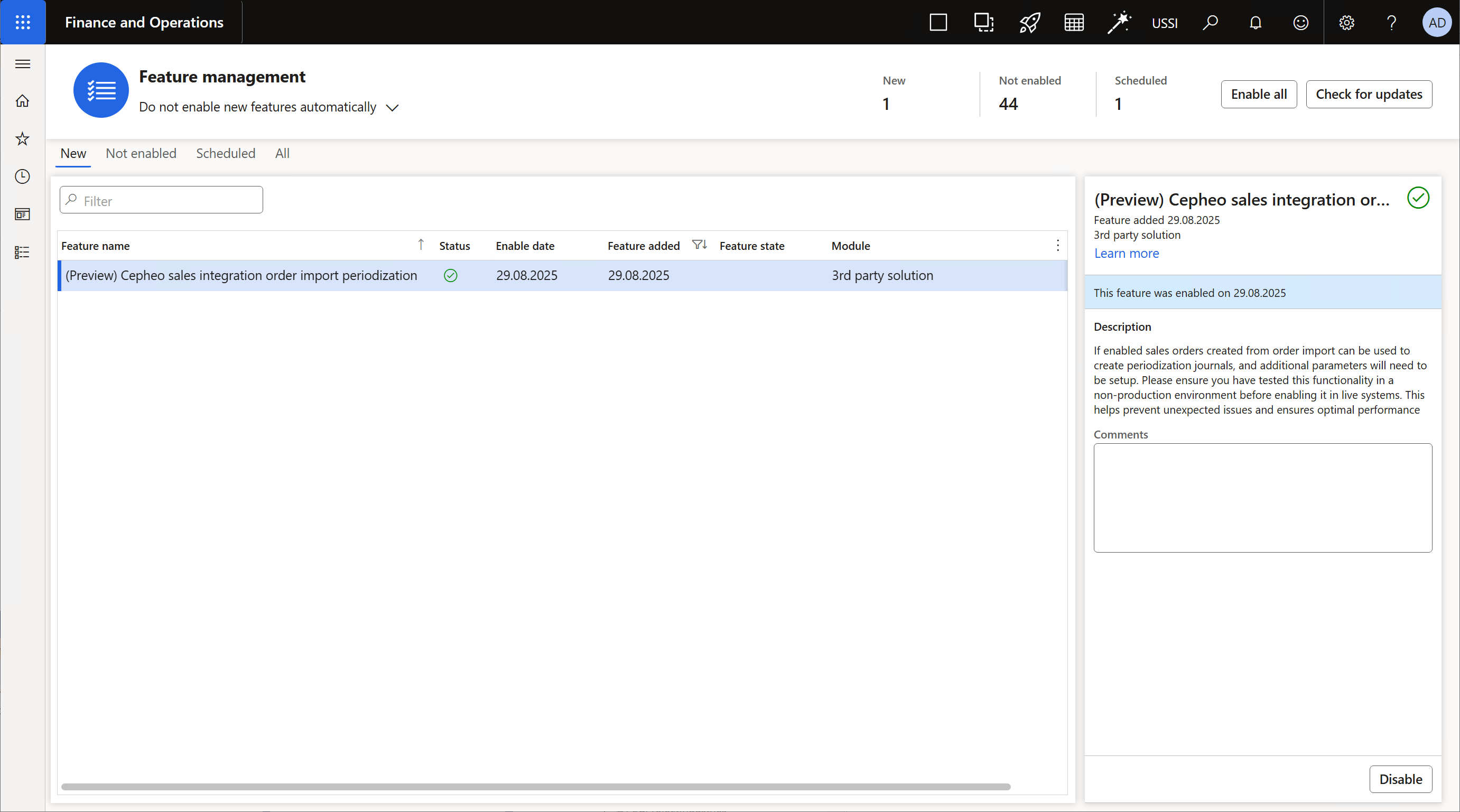 Go to: Feature management and enable: (Preview) Cepheo sales integration order import periodization