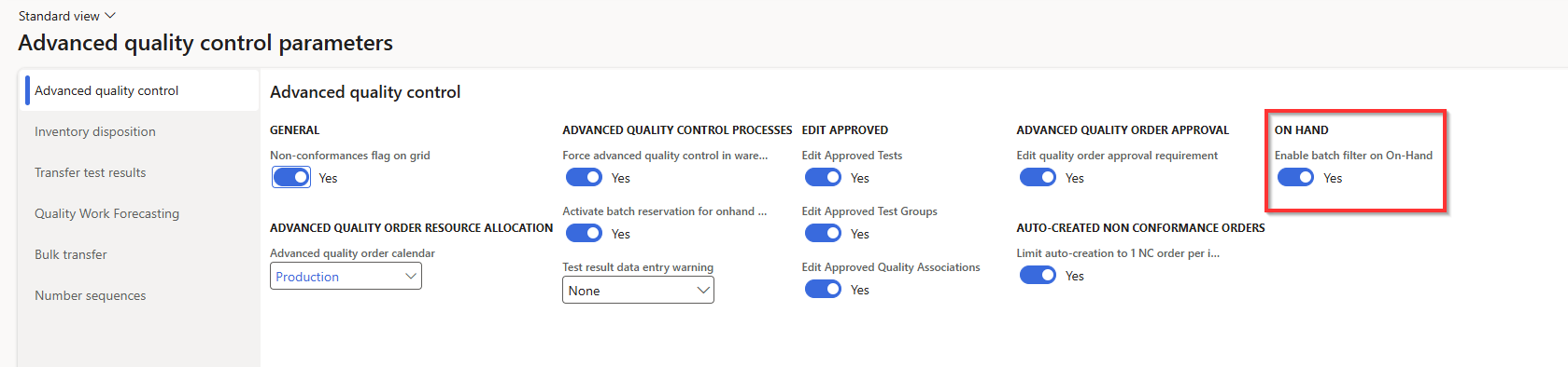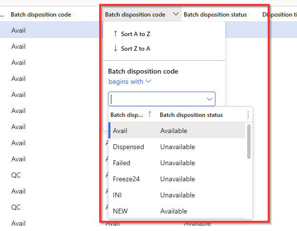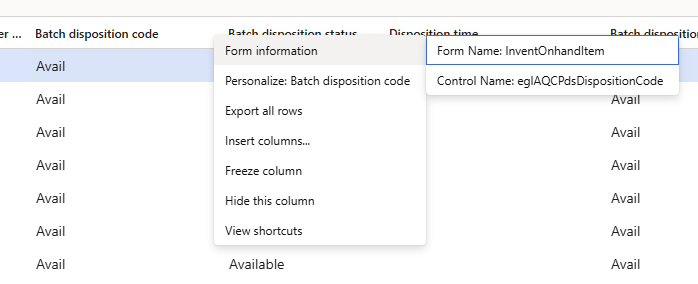 The fields in the On-Hand form are dynamic fields changing based on the dimensions chosen. Therefore it is necessary to add a new column called batch disposition code, and remove the old one, when the "enable batch filter on On-Hand is toggled to "yes".