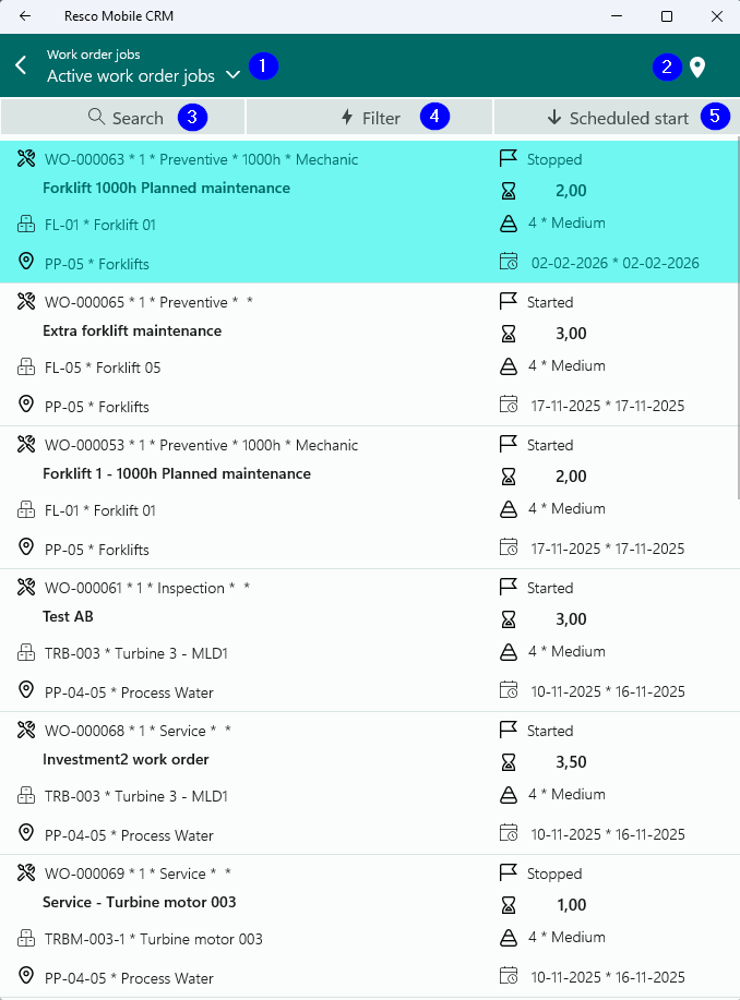 Work order jobs shows jobs assigned to the current worker, which is logged in at the device. Only jobs having an active work order and having schedule Status = Ready, Started, Stopped or Ended are shown.