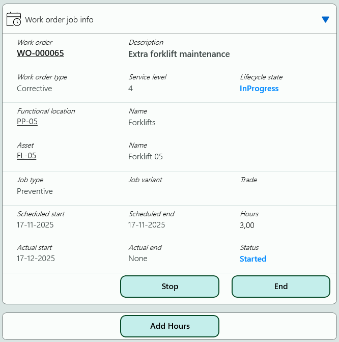 - Work order job info: General job info and buttons for starting, stopping and ending the job.