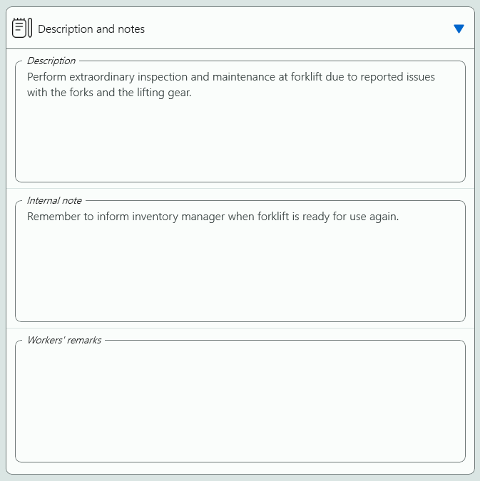 In the work order job details form, all information for executing the job is presented. The form is divided in named sections, which all can be expanded and collapsed.