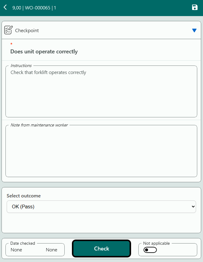 Click [ Check ] to finish the checkpoint or mark "Not applicable", if the checkpoint isn't relevant for the job.