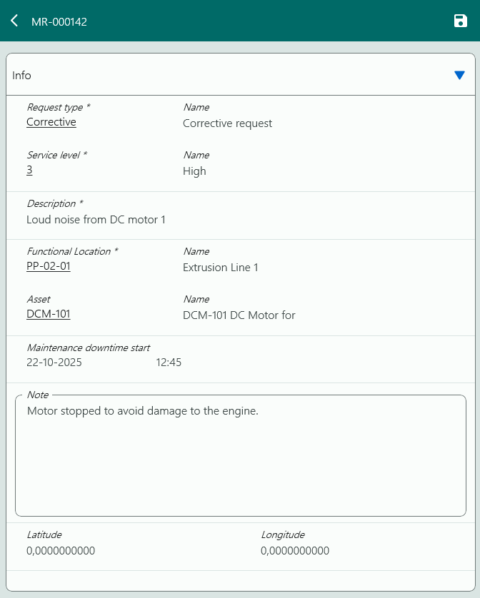 When creating a new request, Request type, Service level, Description and Functional location must be specified. Asset ID is optional.