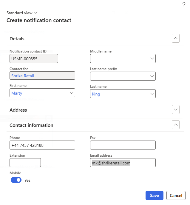 Click on the plus icon (+) after the Notification contact ID to open the Create notification contact dialog.