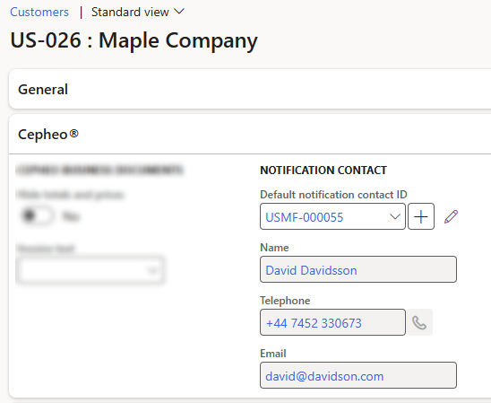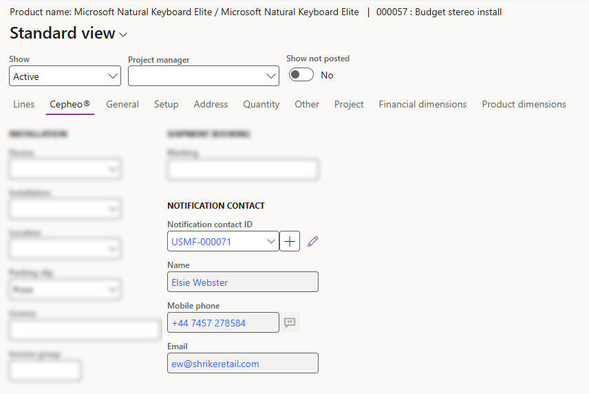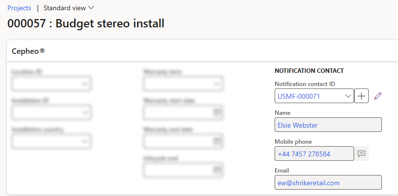 In the Item requirements form select the Item requirements to be edited and navigate to Cepheo > Notification contact.