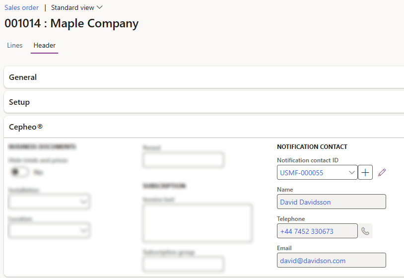 In the form navigate to Sales order > Header > Cepheo > Notification contact