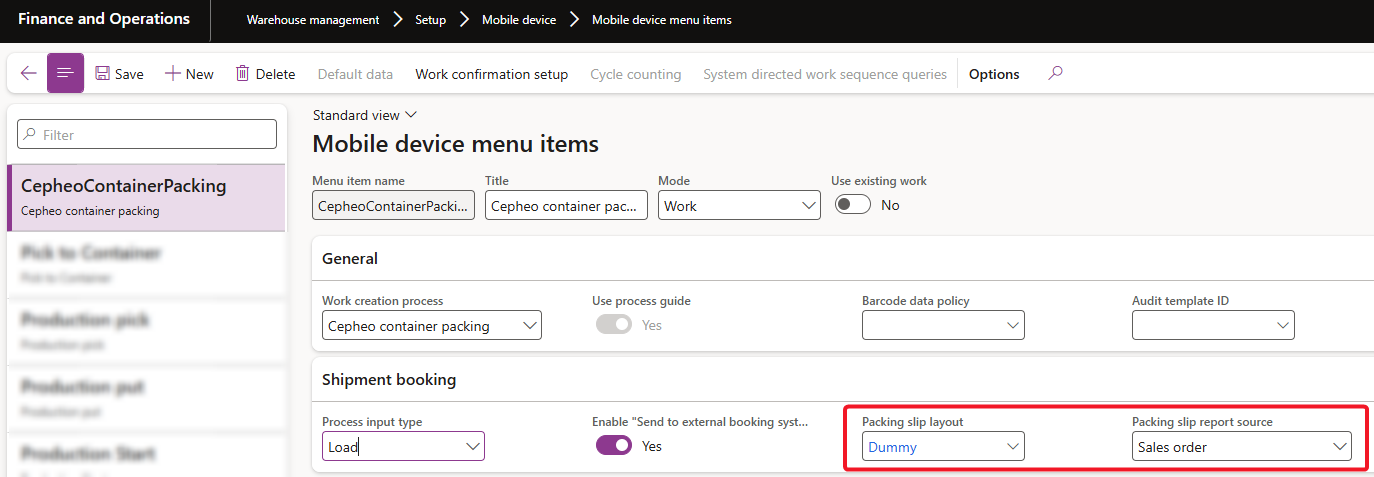 Navigate to Warehouse management > Setup > Mobile device > Mobile device menu items