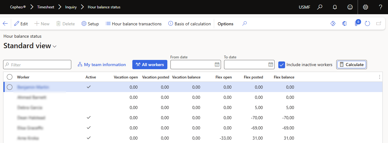 The Hour balance will always be open with the filter My team information, but no calculations are performed automatically. Similarly, switching to the All workers view loads all workers are loaded, but does not trigger calculation.