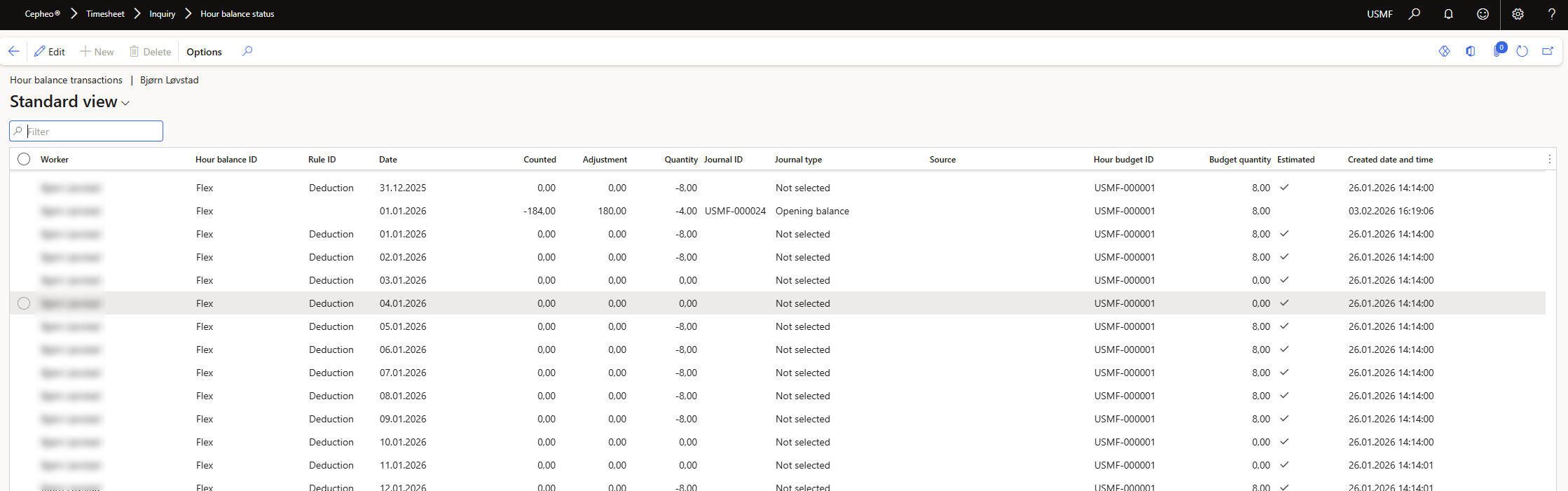 A simplified view over all Hour balance transactions used to calculate the total for selected Hour balance calculation.