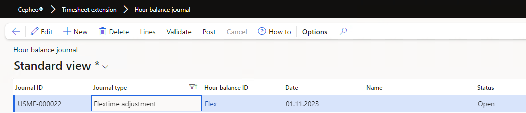Navigate to Cepheo® > Timesheet > Timesheet > Hour balance journal in the Modules menu.