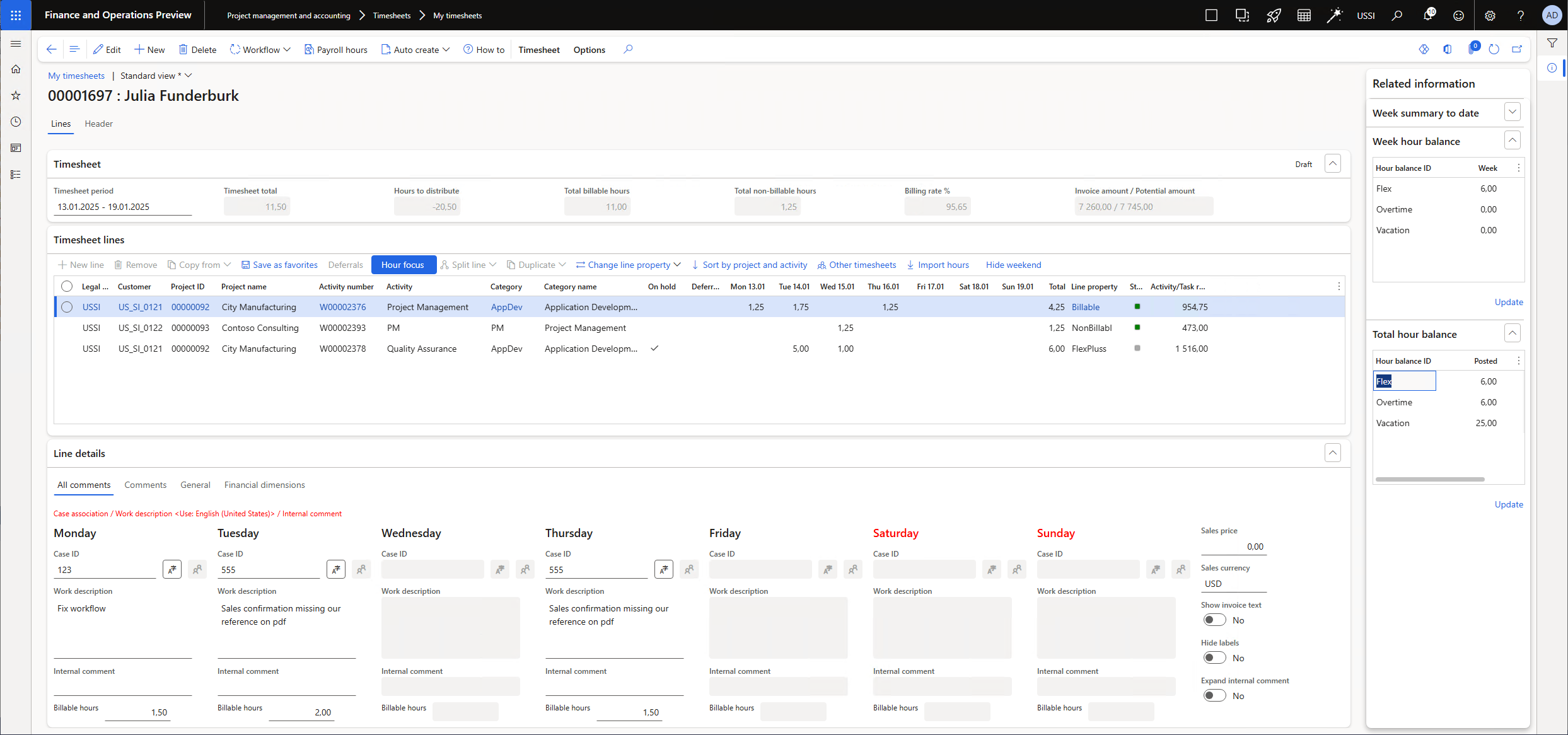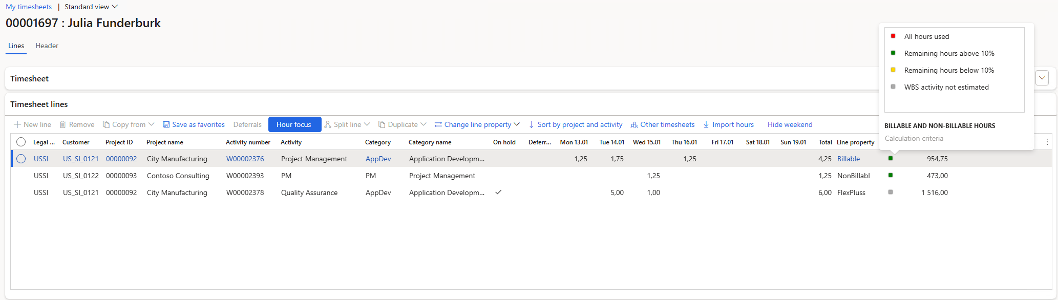 - Total billable hours: Shows how many hours of totals in timesheet lines that will be billed. Definition of billable hours are defined by the line property setup in standard project.