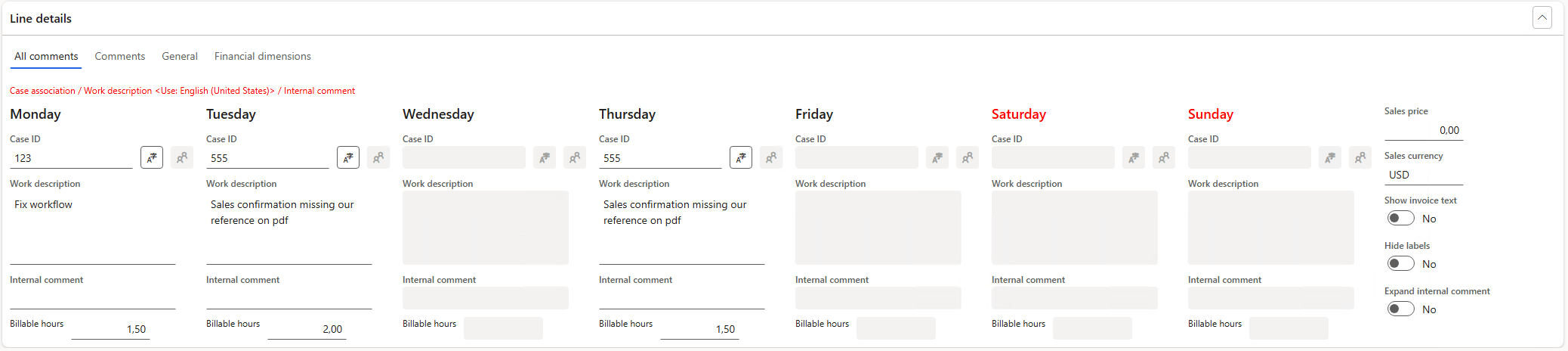 - Case association: This field presumes the use of integration between Dynamics 365 Customer Service and Dynamics 365 Finance and Operations. If the integration is active, users can select which case they have worked with from drop-down menu. Based on selected case, external comment will be updated with case number and reference person on the case. This speeds up the process of documentation, reduces time spent on registering hours and ensures alignment of comments across users towards your customers.