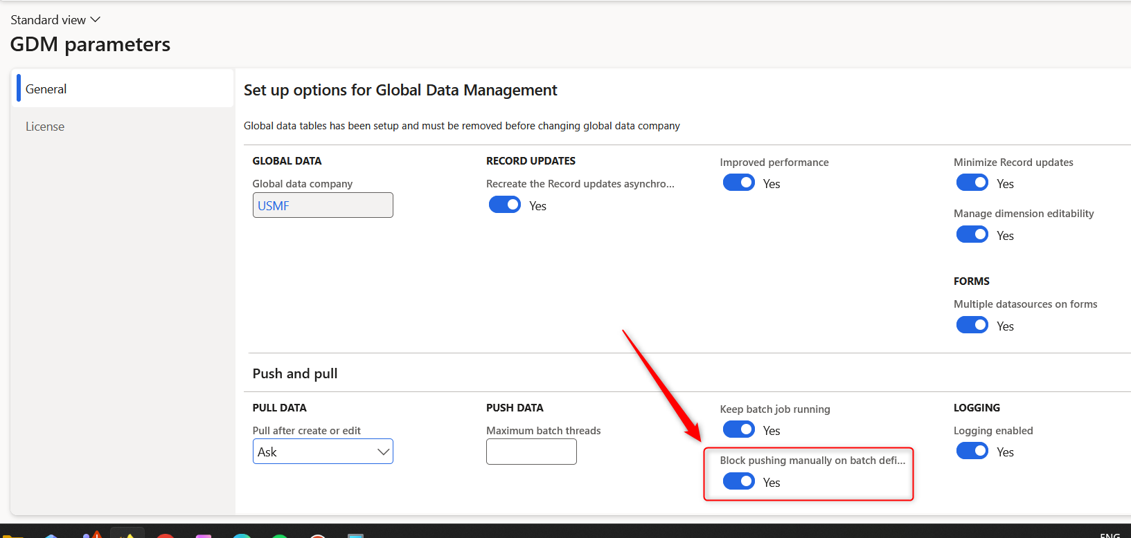 By default, GDM will allow manual control (push) over any record update available for push, regardless of its origin (manual or batch). There's an option to block manual push for batch-driven record updates. To enable this, Block pushing manually on batch definitions parameter needs to be turned on in the GDM main parameters. This requires running batch job for GDM data push.