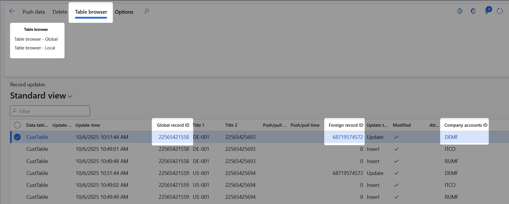 - Table browser - Local - opens table browser in a local company for a given record update (Foreign record ID identifies the entry). If local entry does not exist, all records present in a table for a local company will be displayed