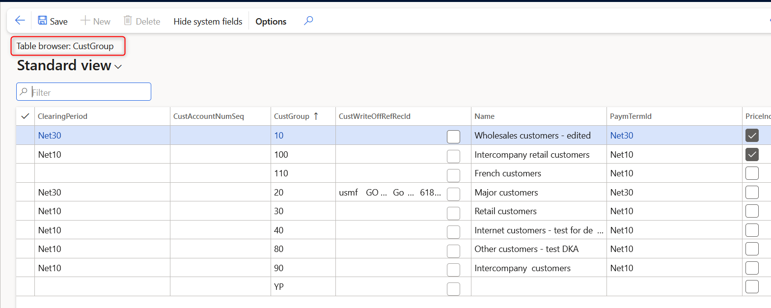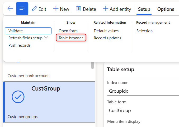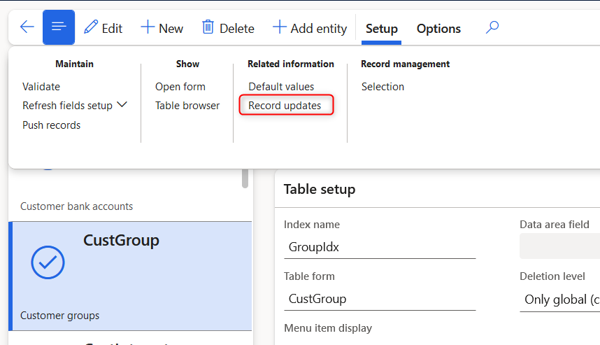 Table browser can also be accessed from the Record updates page. This applies for the page opened in the GDM Management table setup and in the specific form with data (like Customer groups, Items etc.).