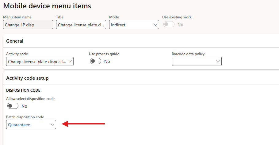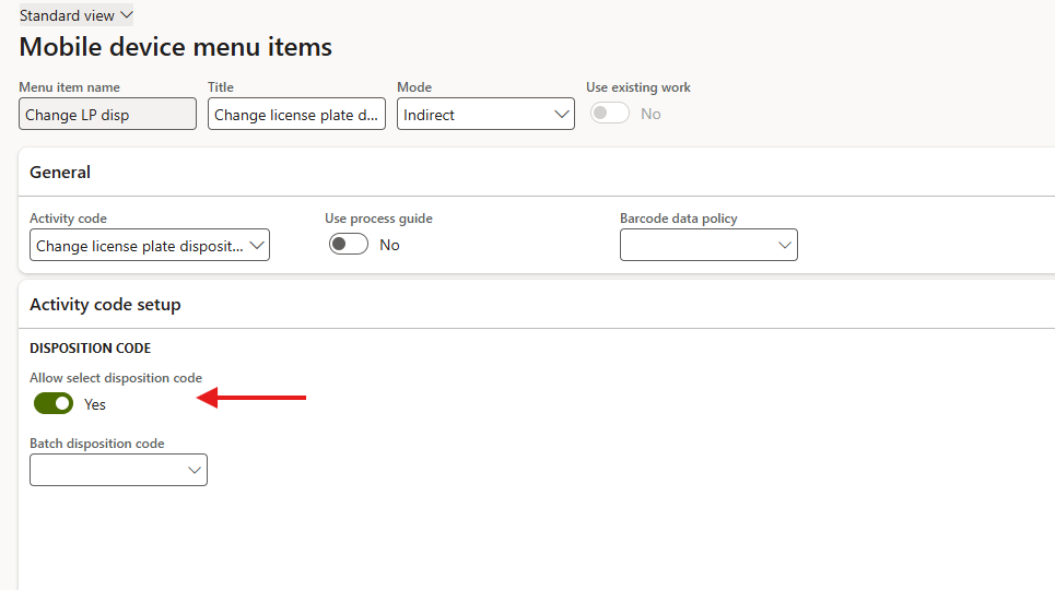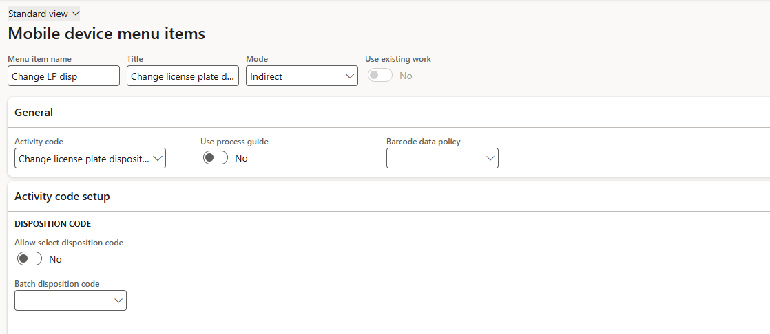 However, in certain situations, a warehouse worker must manually assign a disposition code to a license plate using the Warehouse Management app. For this purpose, the Change license plate disposition activity code has been introduced for use in mobile device menu setup.