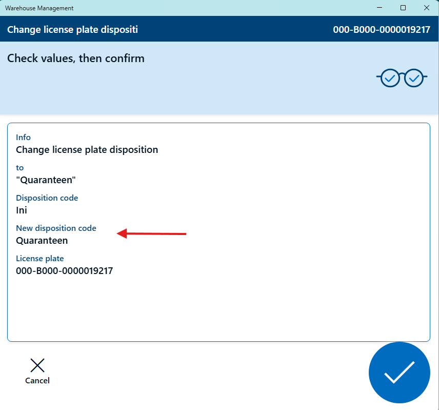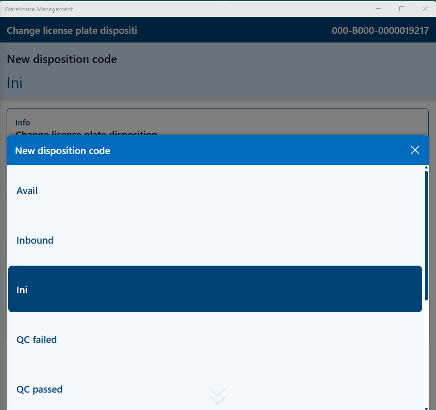 - User directed - the warehouse worker can decide which disposition code should be assigned to a given license plate.