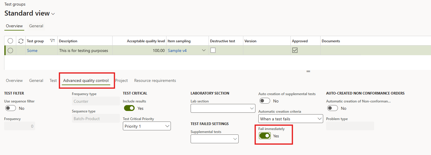 The Fail immediately feature provides greater agility in quality management by ensuring that non-conforming batches are flagged in the system the moment a critical failure is detected. This reduces lead times for quality decision-making and prevents unnecessary delays in processing quality orders that have already failed their primary release criteria.