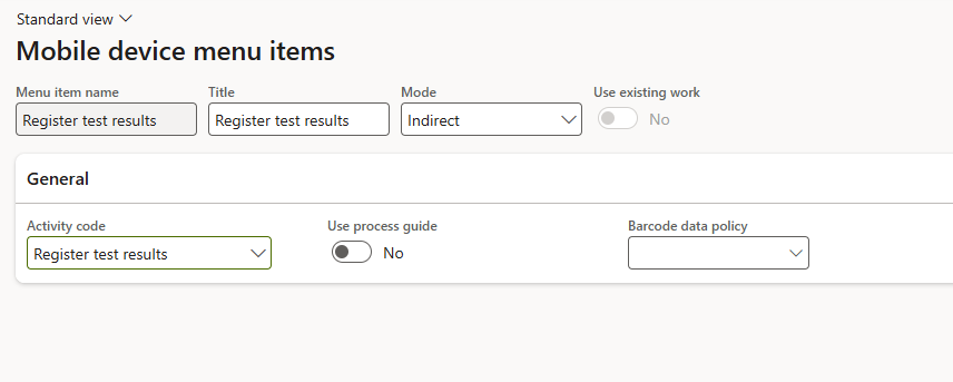 To enable registration of test results for an advanced quality order, create a menu item with Register test results selected in the Activity code field, as shown below: